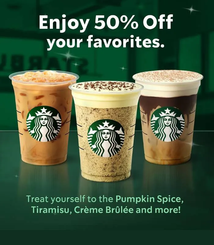 - Offer is only applicable on Frozen Berry Hibiscus Starbucks Refresha, Frozen Mango Dragonfruit Starbucks Refresha, Frozen Strawberry Acai Starbucks Refresha, Tiramisu Latte, Tiramisu Iced Americano, Tiramisu Iced Latte, Tiramisu Frappuccino, Crème Brulée Brown Sugar Frappuccino®, Crème Brulée Cold Brew, Crème Brulée Iced Americano, Peach Apple Cream Iced Tea, Pumpkin Spice Latte, Iced Pumpkin Spice Latte, Pumpkin Spice Coffee Frappuccino, Pumpkin Spice Crème Frappuccino, Iced Tiramisu Matcha Latte, Iced Pumpkin Spice Matcha Latte